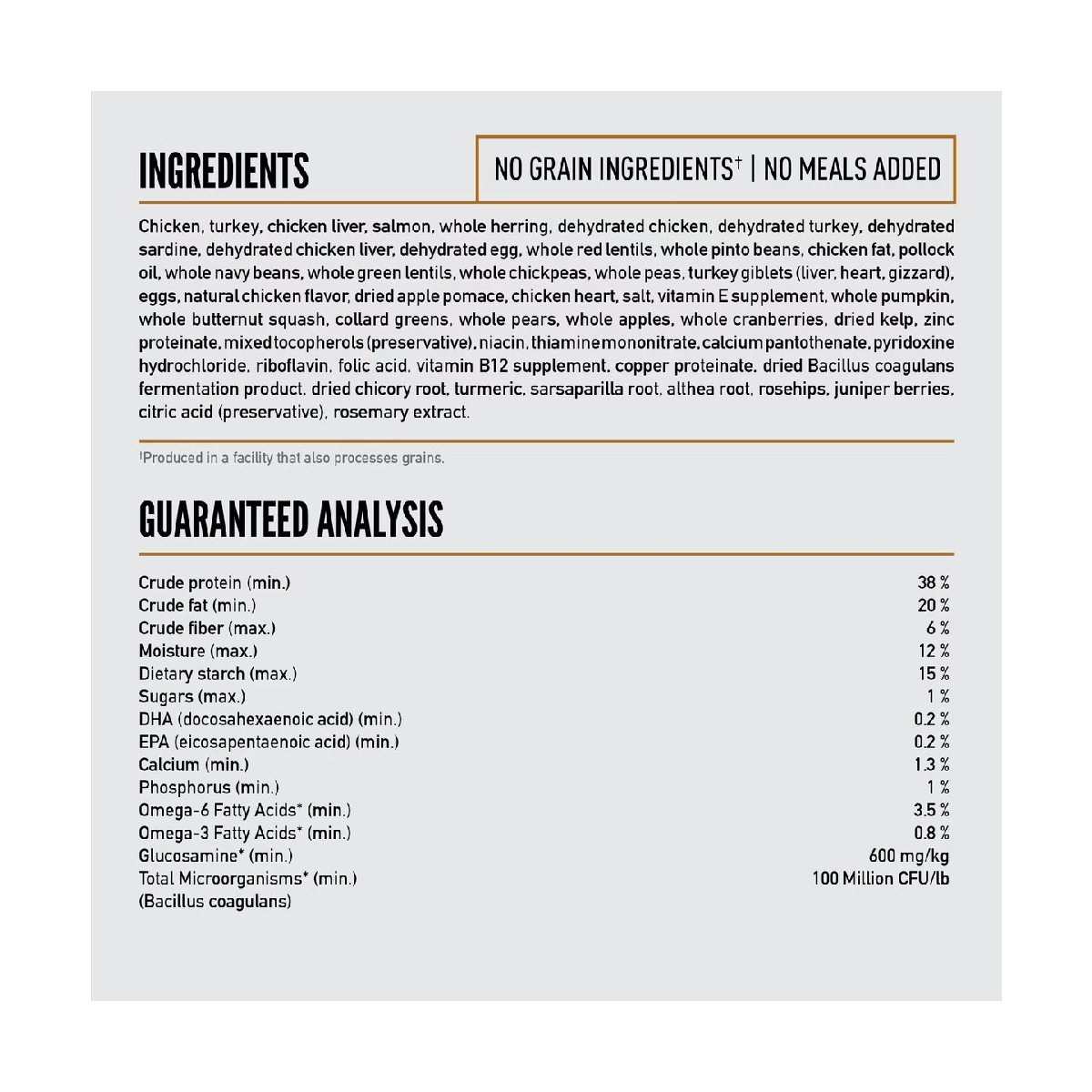 材料:鶏肉、七面鳥、七面鳥ギブレット(レバー、ハツ、砂肝)、ヒラメ、サバ、卵、鶏レバー、ニシン、乾燥鶏肉、乾燥七面鳥、乾燥サバ、乾燥鶏レバー、乾燥卵、赤レンズ豆、ピント豆 、エンドウ豆、鶏脂、レンズ豆ファイバー、ポロックオイル、グリーンレンズ豆、ネイビービーンズ、ナチュラルチキンフレーバー、ひよこ豆、エンドウ豆澱粉、鶏ハツ、塩、カボチャ、バターナッツスカッシュ、カラードグリーン、梨、リンゴ、クランベリー、乾燥ケルプ、亜鉛プロテイネート、混合トコフェロール(防腐剤)、一硝酸チアミン、パントテン酸カルシウム、ビタミンEサプリメント、銅プロテイネート、乾燥チコリ根、ターメリック、サルサパリラ根、アルテア根、ローズヒップ、ジュニパーベリー 、クエン酸(防腐剤)、ローズマリー抽出物、乾燥ラクトバチルスアシドフィルス発酵製品、乾燥ビフィドバクテリウムアニマリス発酵製品、乾燥ラクトバチルスカゼイ発酵製品。